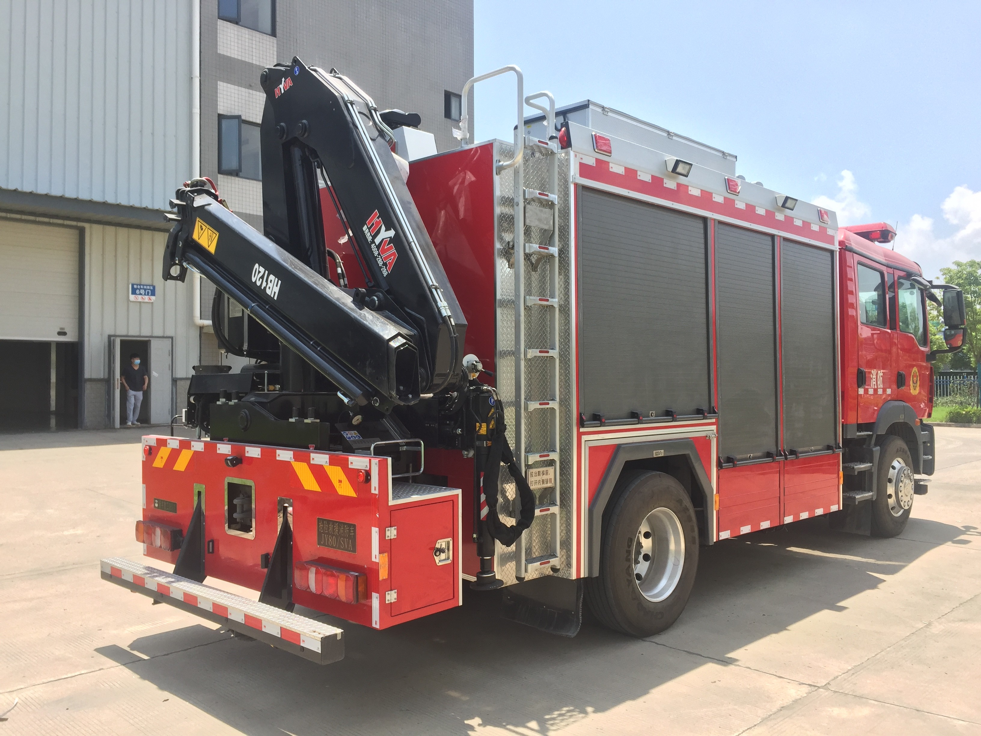 รถดับเพลิงกู้ภัยฉุกเฉิน JY80 ติดตั้งเครื่องกว้านไฟฟ้ารุ่นแชมป์เปี้ยนของสหรัฐฯ รุ่น N16800XF;มันใช้เครื่องกำเนิดไฟฟ้าฮอนด้า SHT11500;หลังคาติดตั้งระบบไฟยก YZH4-5.04CA;และด้านหลังติดตั้งเครนรถบรรทุกระบบไฮดรอลิก SQ5ZK2 ที่ผลิตโดย XCMGช่องใส่อุปกรณ์ใช้โครงสร้างของการหมุนและการดึงซึ่งมีระดับการรวมสูงและสะดวกในการใช้งาน
